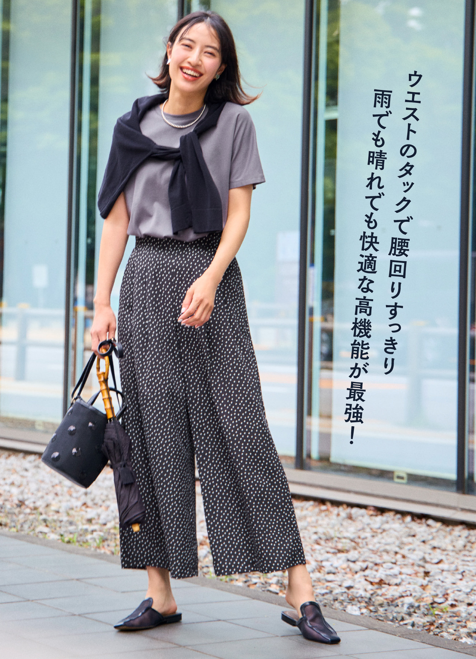 スカート一択でレインブーツも有りですが、暑い日だと蒸れも気になるしパンツが必要な時もあるし。雨の日だってやっぱりきちんとした格好をしなくちゃいけない人も大多数ですよね。