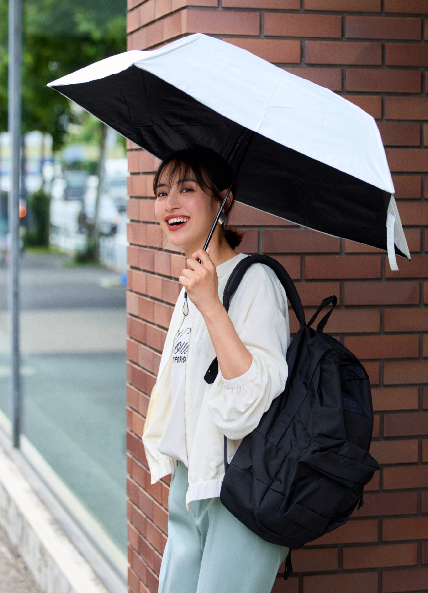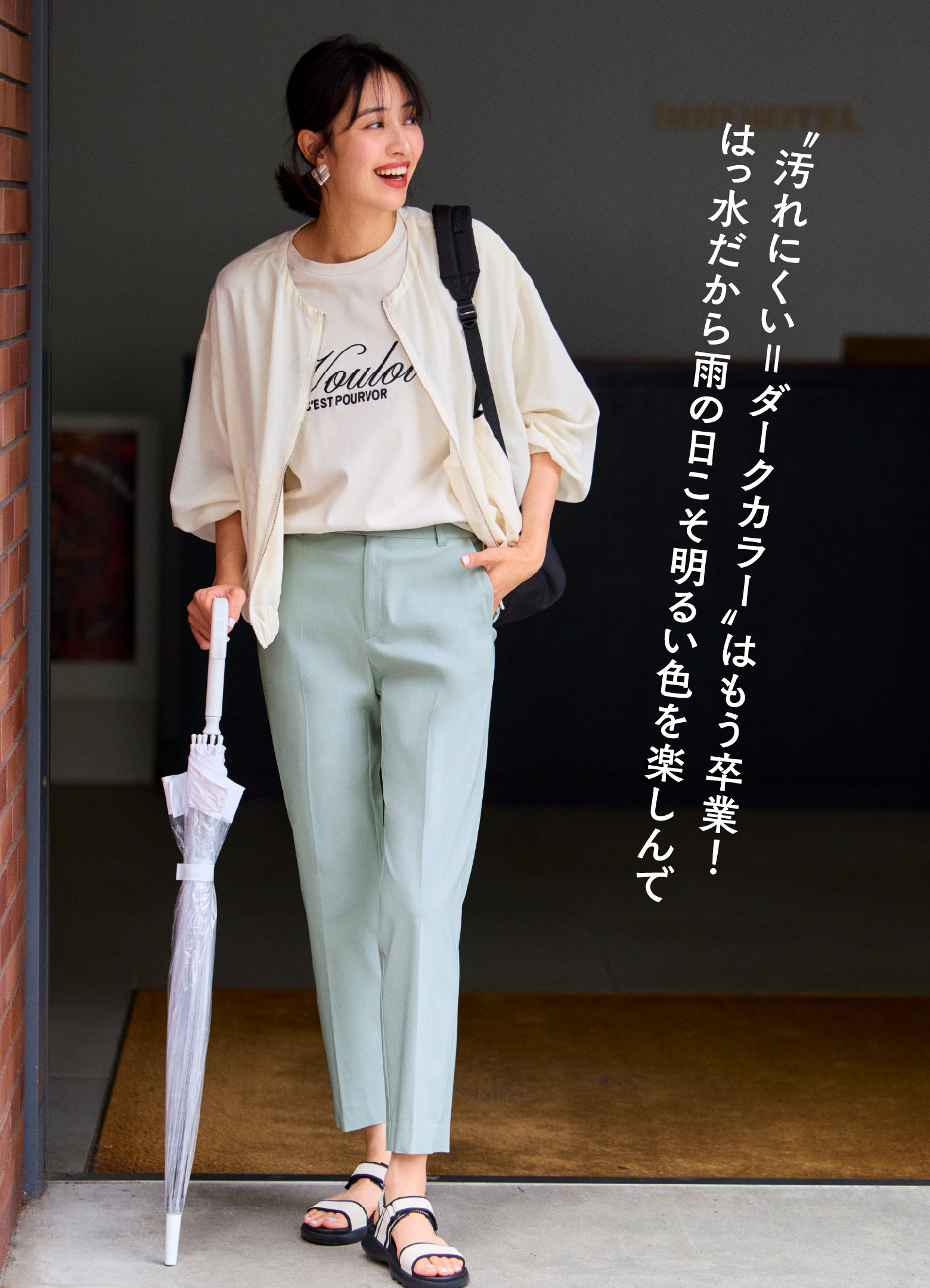 そうそう。センタープレスが入ってるから脚がキレイに見えて!きれいめコーデにはベージュとか淡い色もおすすめです。“はっ水”があれば、淡い色でも気にせず使えますね!