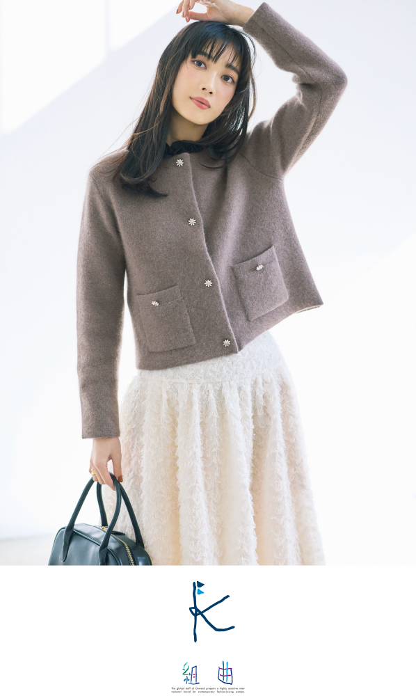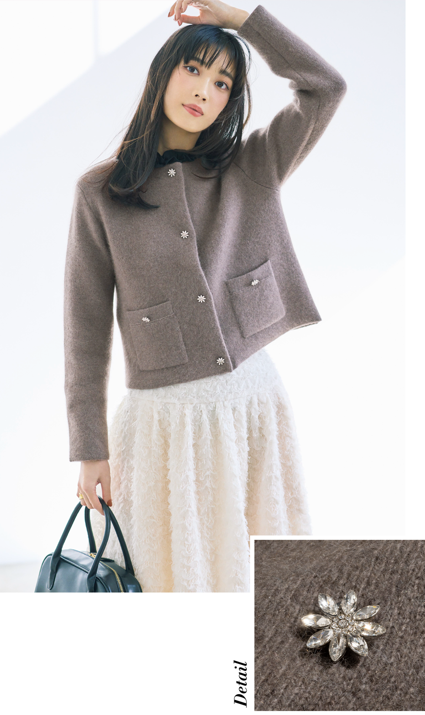 ラクーン混のニットジャケット。コートを脱いでもきちんと感をキープできるから、お仕事や初対面のデートでも好印象!キラッと輝くお花型のビジューボタンが愛らしい。