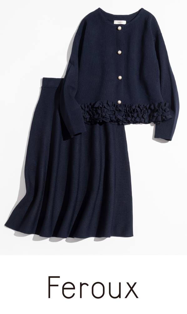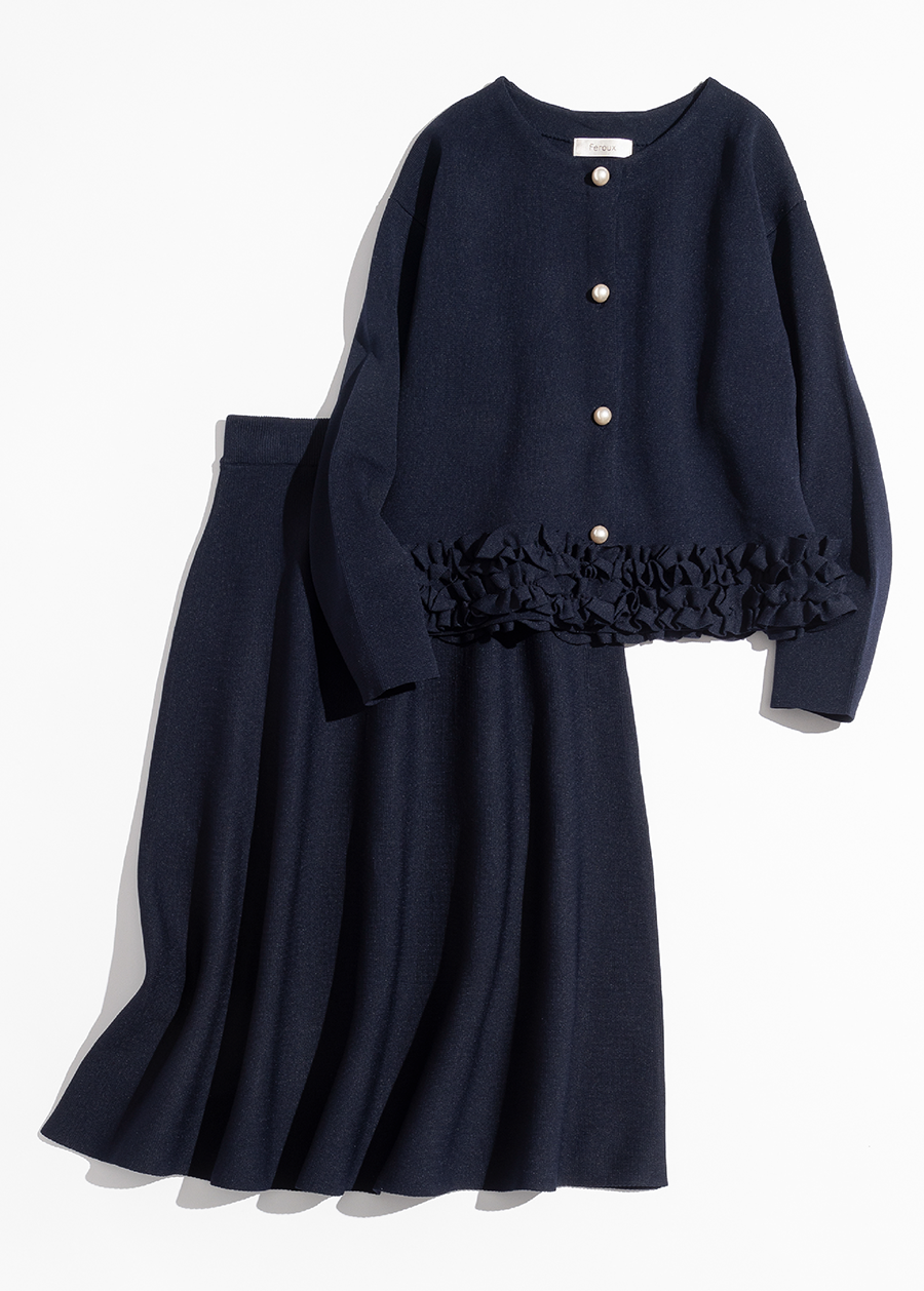裾のフリルデザインとパールボタンがアクセントになったトップスと、フレアスカートがセットになったニットアップ。これだけで華やかだから、合わせる小物に悩む必要なし!自宅で手洗いできるからお手入れも簡単。