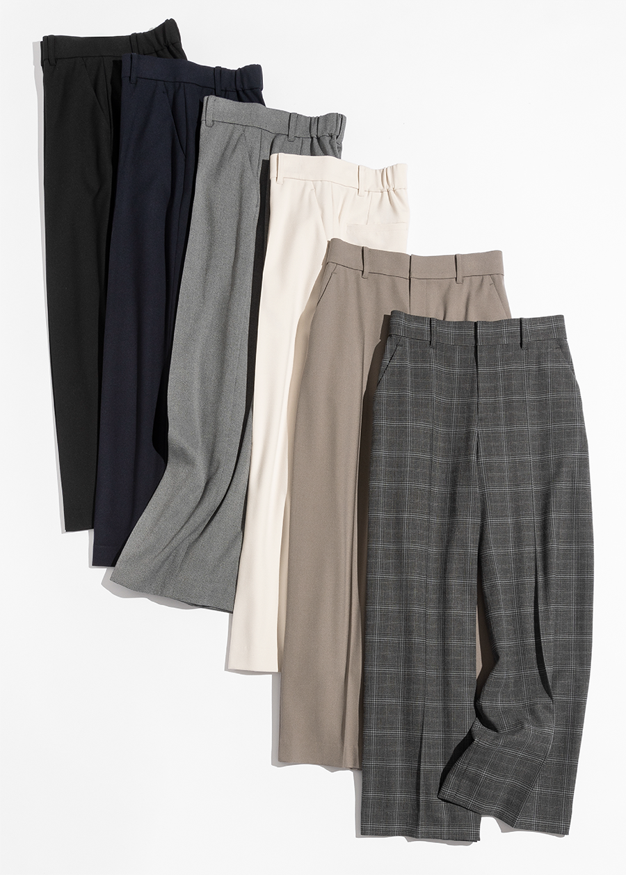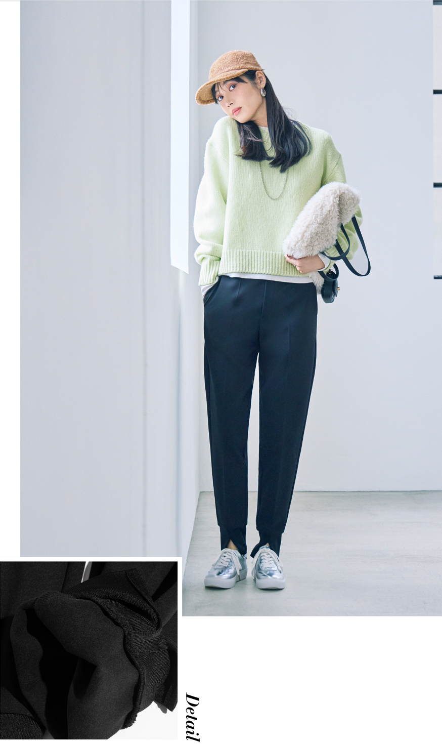 落ち感のあるしなやかな素材で、ラフな印象にならず品良く穿ける。丈違いありの計8サイズ展開だから、パンプス派もスニーカー派もぴったりの丈が見つかるはず!