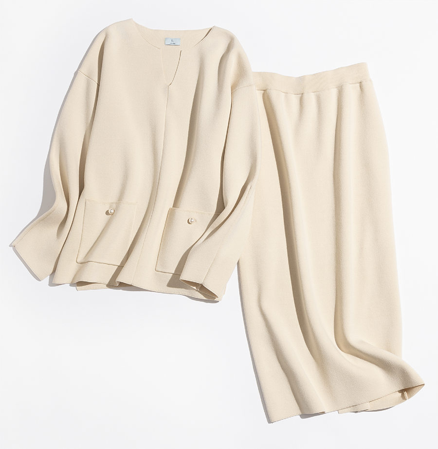 なめらかな質感で3シーズン使えるニットセットアップ。顔周りがすっきり見えるキーネックは、ブラウスなどを重ね着しても可愛い!スカートは後ろスリット入りで、足さばきもOK。